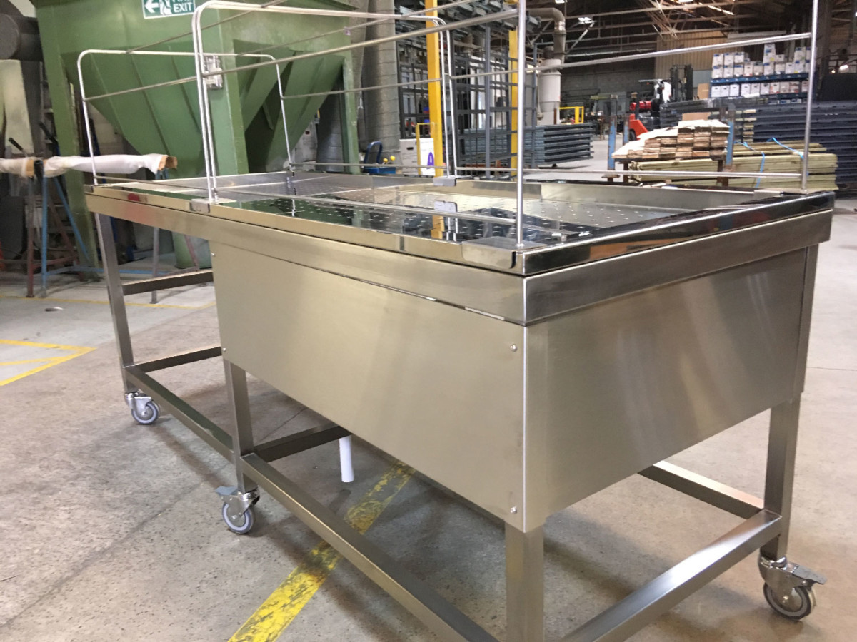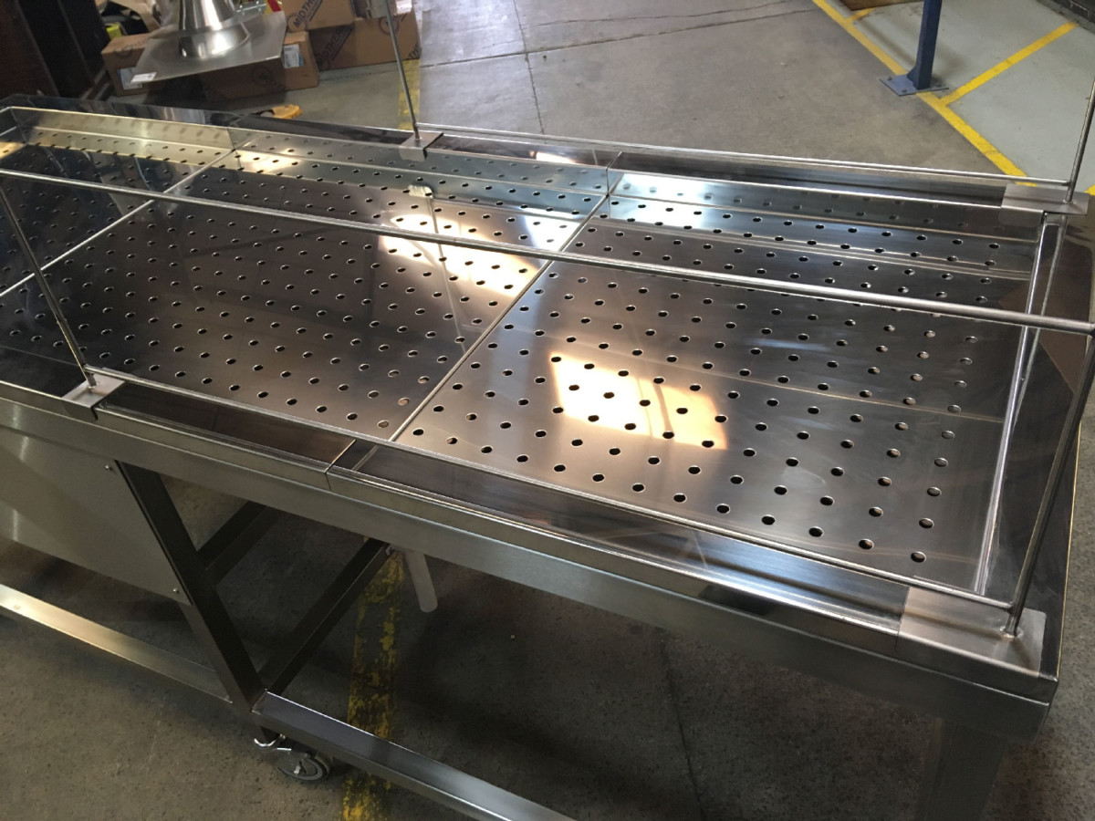 The Trays are fully removable with the Sparge section underneath in satin finish towards the drain outlet. Privacy covers were made for the Table but again are fully removable. The Table is fully mobile and on Braked Castors.