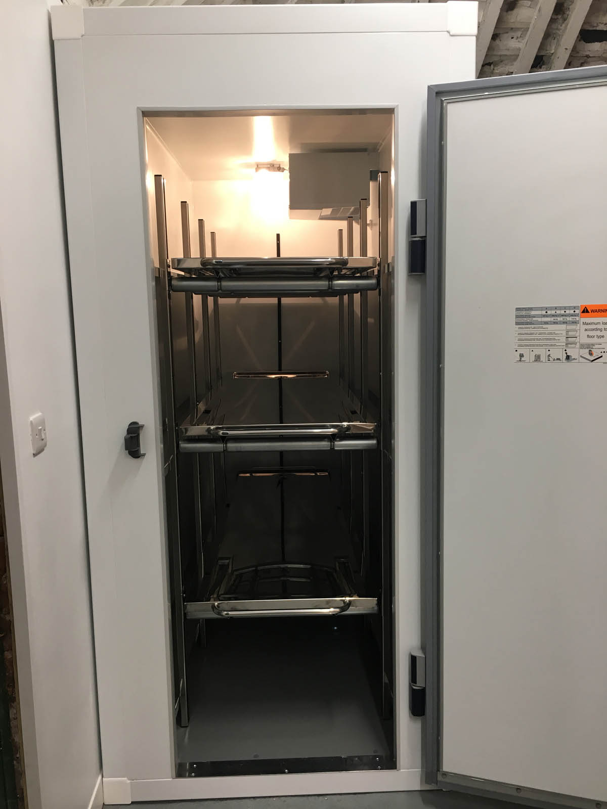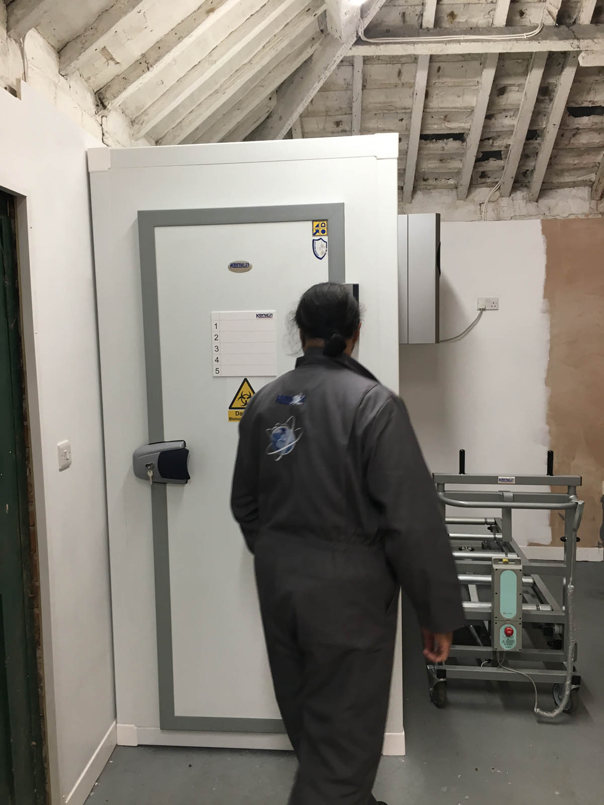 Kenyon were approached by a well- known prestigious Funeral Director in North Wales who are expanding to 4 branches. Kenyon supplied them with Mortuary equipment over ten years ago that has been running without a hiccup ever since installation. Kenyon were asked to supply one of their High Efficiency 100% totally Modular single door Body Chambers. The Kenyon Chamber utilises a unique patented “Profile System” where every Panel locks in to a Profile. There is no need for Angle section, Screws, Rivets or Capping to cover and hide cut and carve Panels. Using Profiles creates super energy efficiency and a much lower Carbon Footprint. The Door opening was made to 800 mm wide to allow for Coffin access.