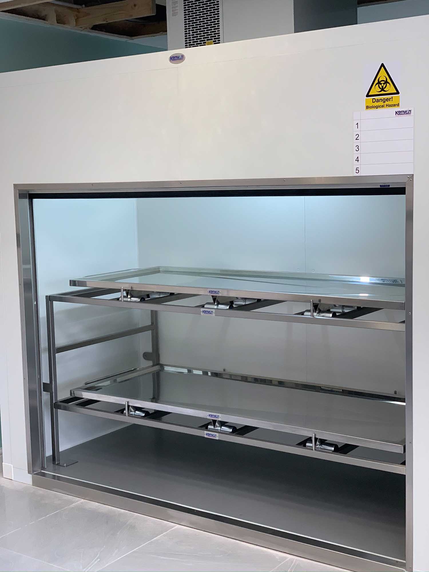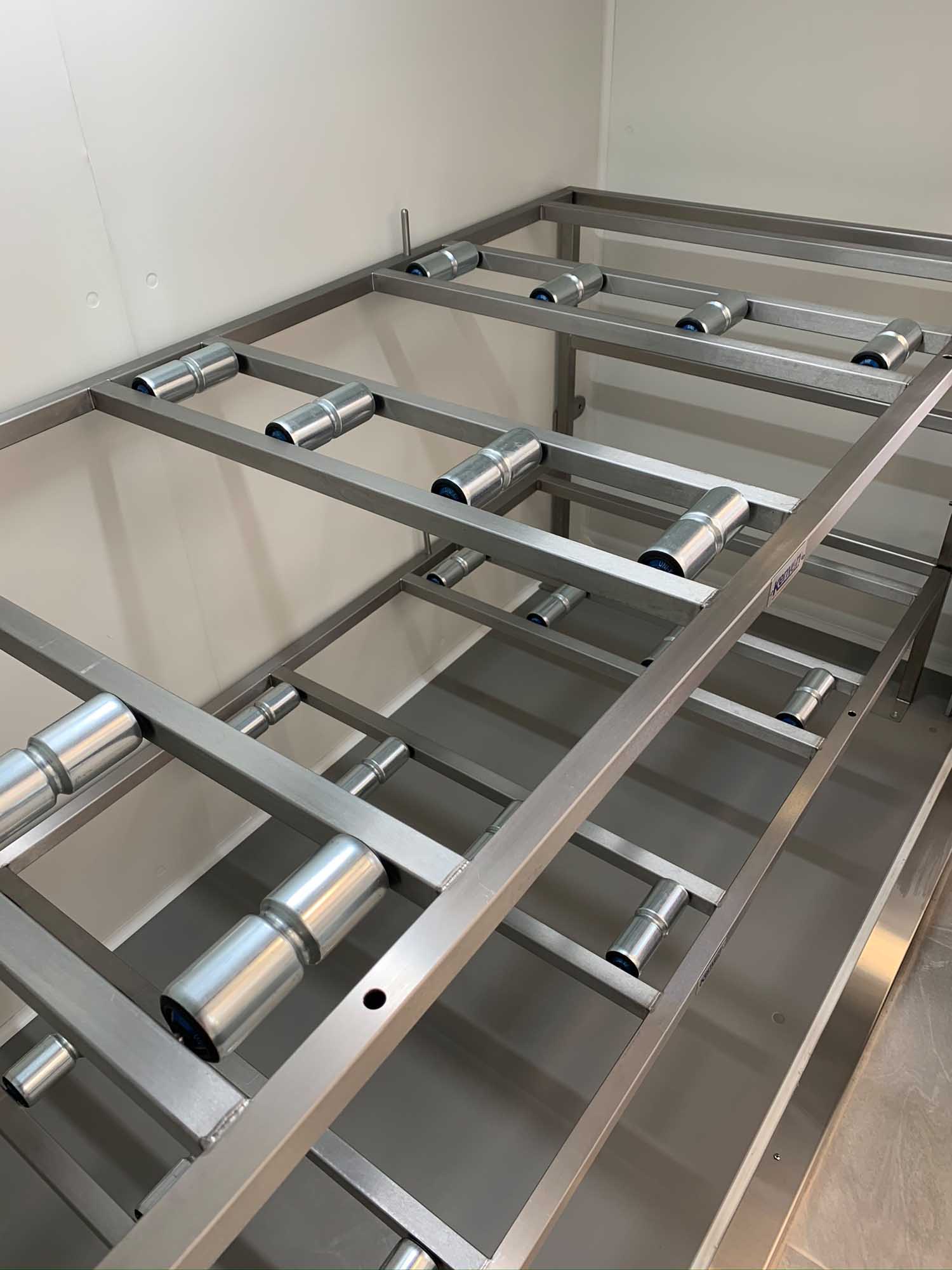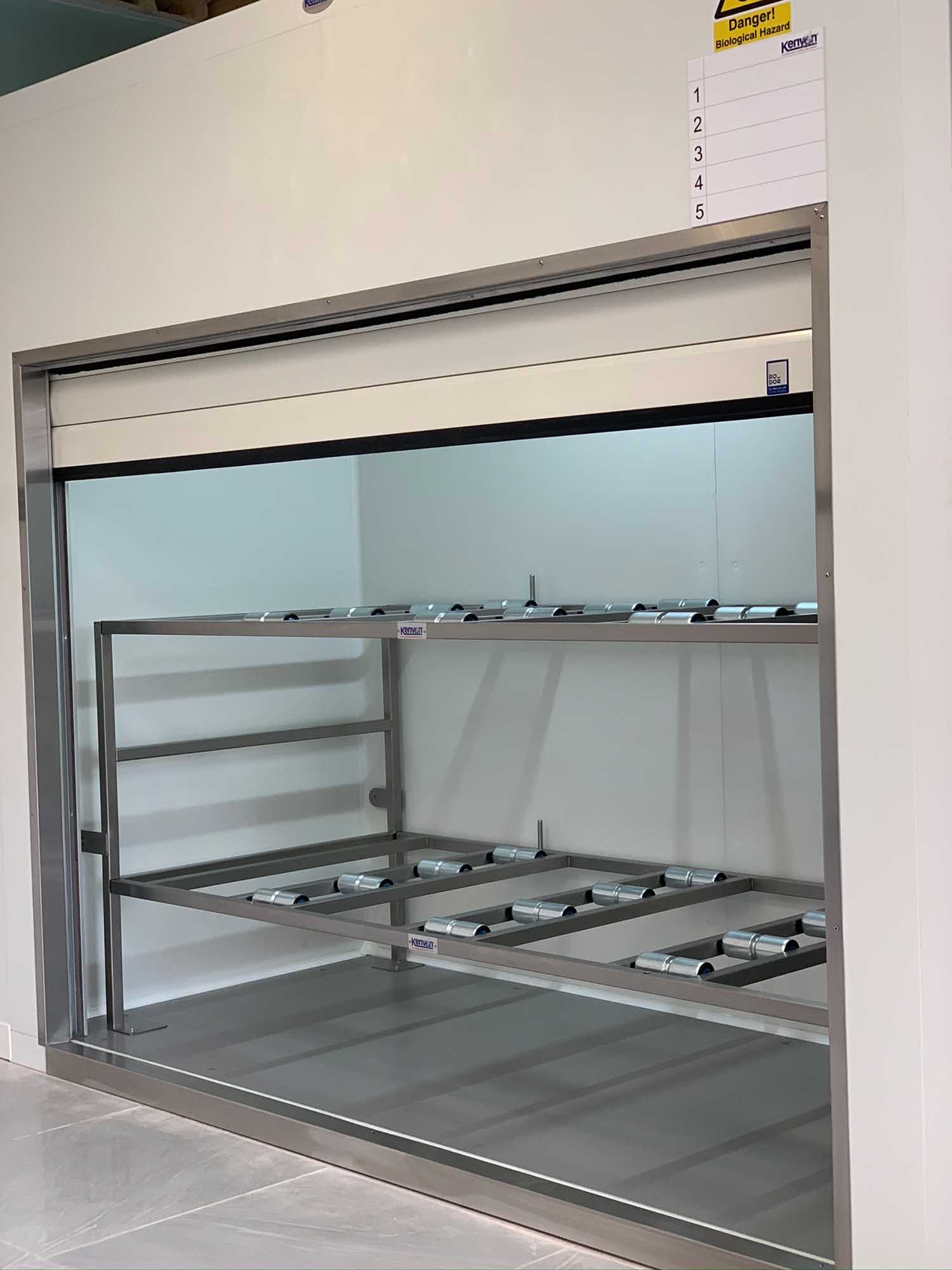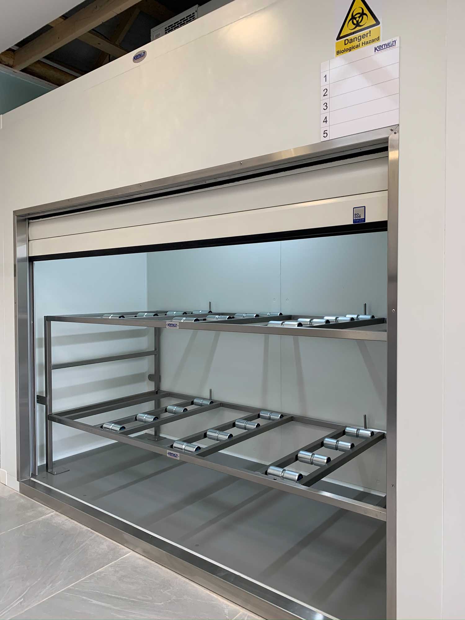 The Kenyon Lateral Chamber was fitted with an insulated roller shutter door, complete with rubber “sweeper gasket.” Interior furniture consisted of 316 Stainless Steel racking with stub rollers. The body trays were bright polished and 316 Stainless Steel complete with drain hole and plug.