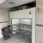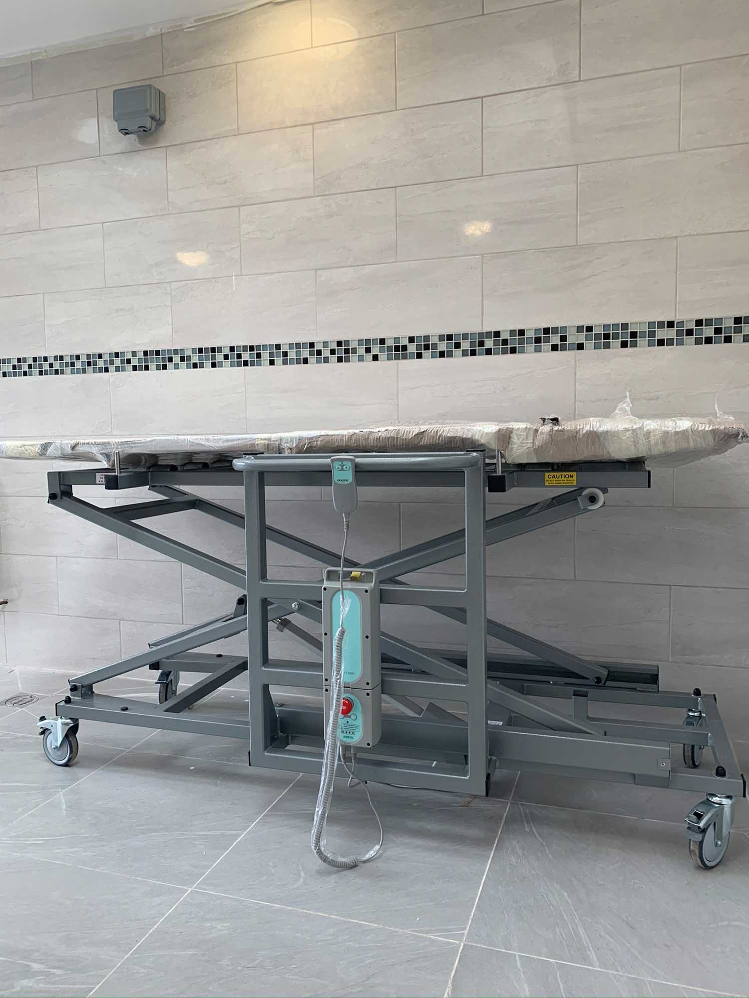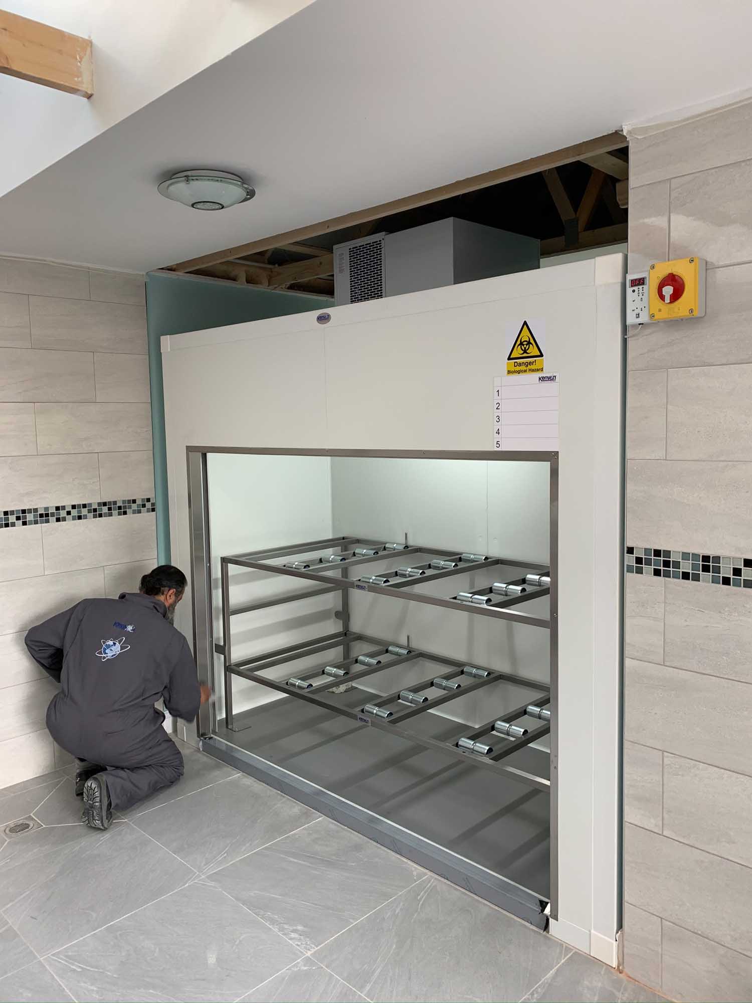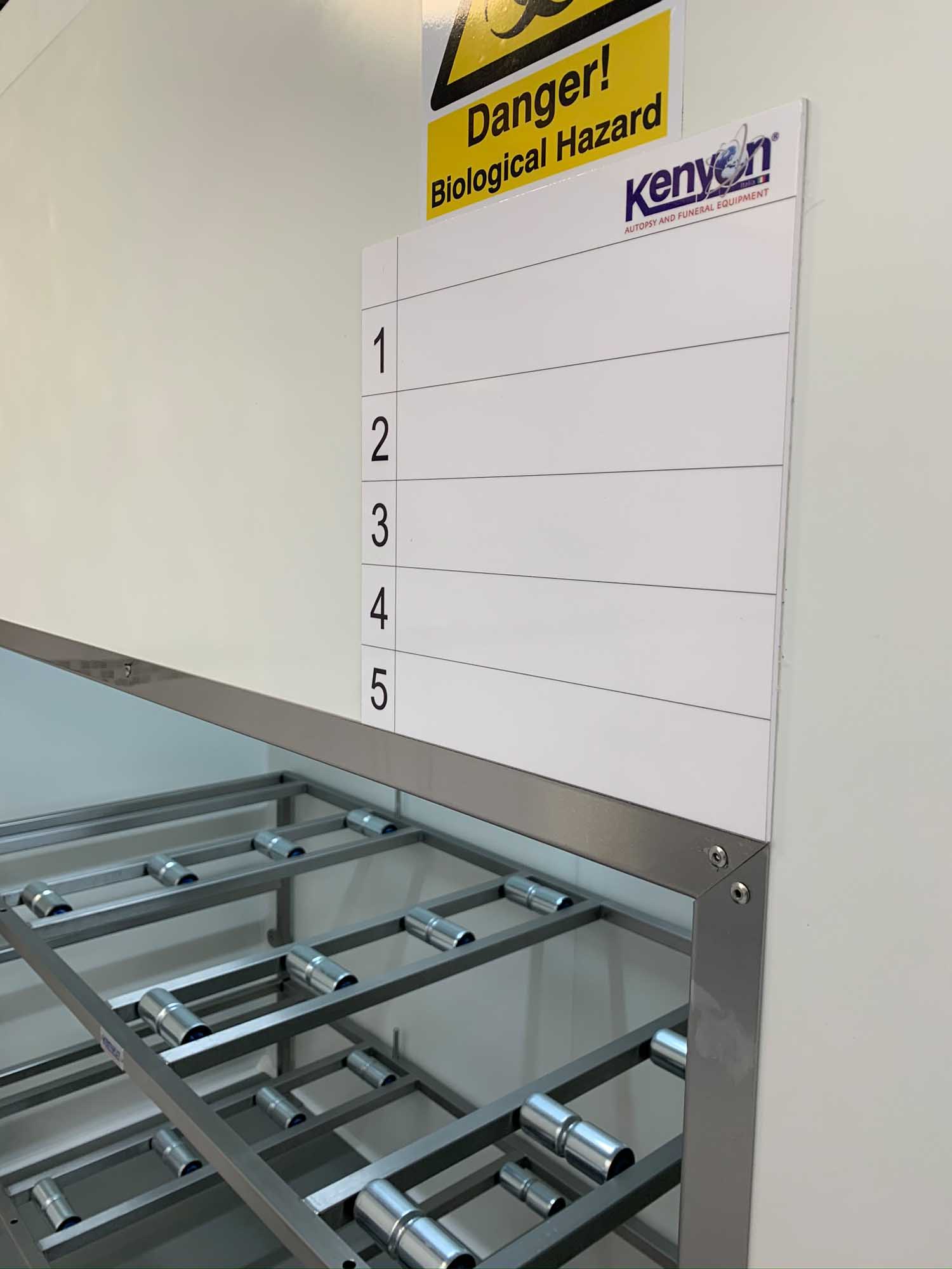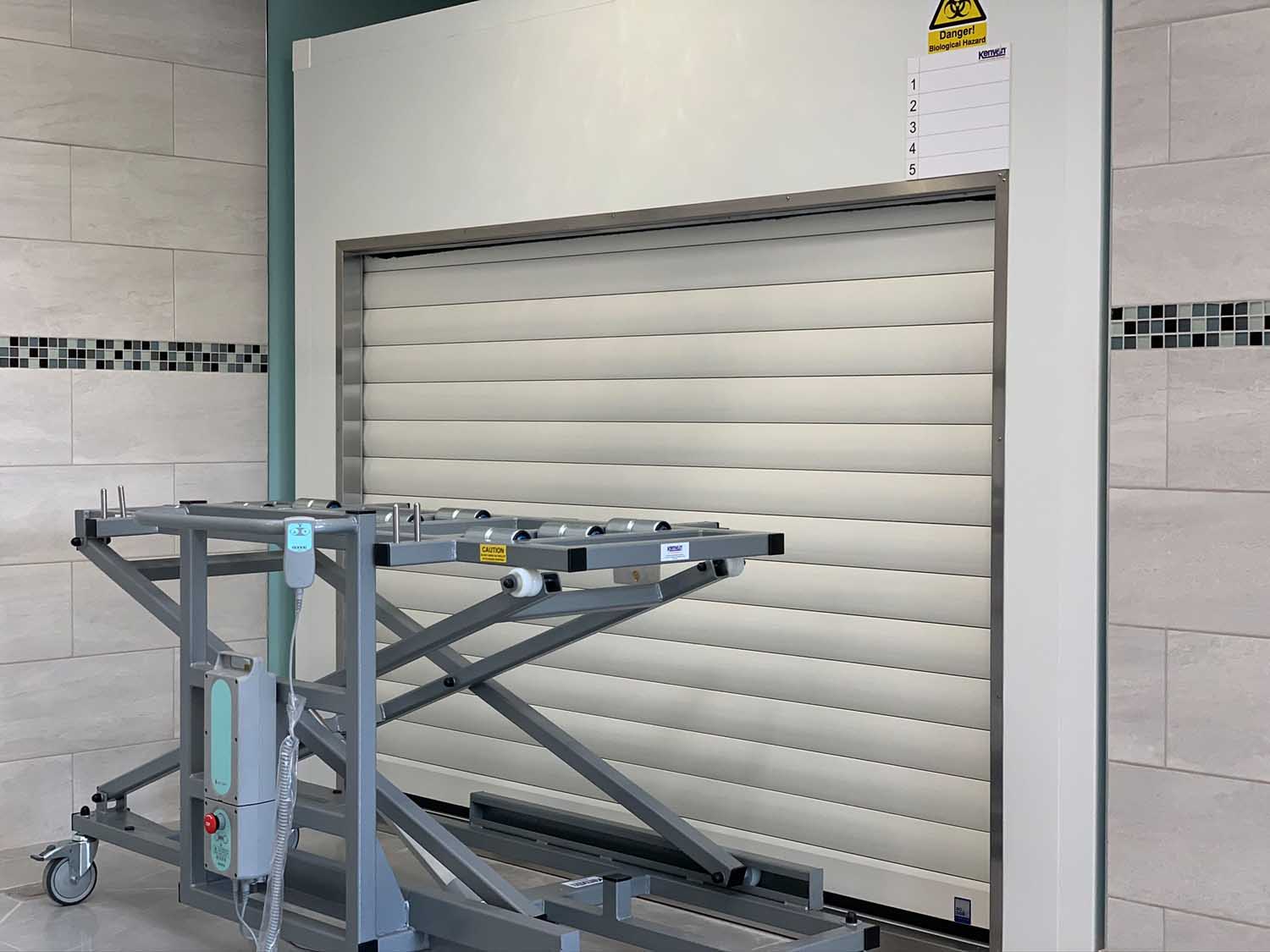 Kenyon also supplied their HET style “Touch Button Electric Trolley”. Electric being the chosen medium as that would make carrying out the removing and inserting of the Kenyon Trays much easier for everyone. This trolley is used for un-loading and loading the body chamber and for moving around the mortuary safe and secure.