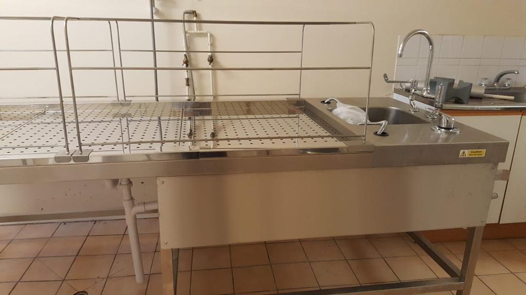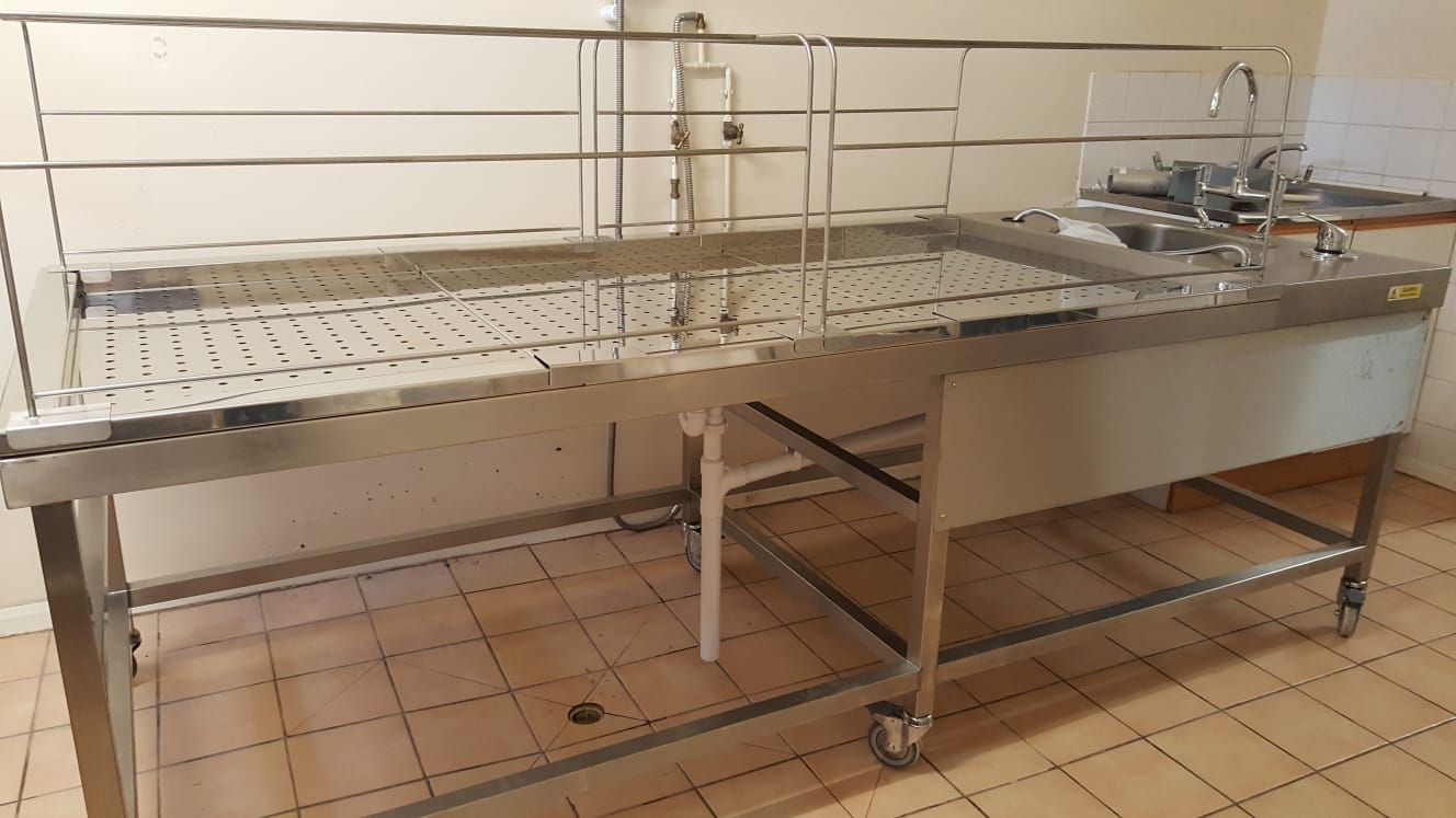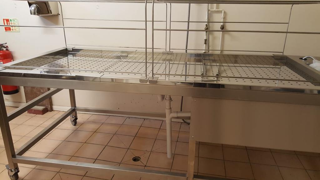 Kenyon were approached by a Mosque in Southend to produce them a Kenyon mobile Ghusal Table. The remit was for the Ghusal Table to be made 1000mm wide which is our standard size. The Table had to be in 316 High Grade Stainless Steel as per the client’s request. The Table consists of three 316 Stainless Steel removable Body Trays with a set optimum quantity of holes laser punched holes and to the unique Kenyon specification size, to allow for faster drain away of foul water. The Table has two Drain Outlets to move water faster from the “Sparge” area.