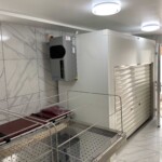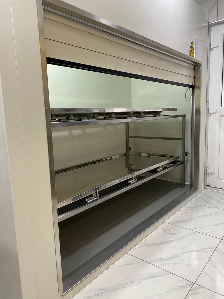 Kenyon also supplied their HET style “Touch Button Electric Trolley”. Electric being the chosen medium as that would make carrying out the removing and inserting of the Kenyon Trays much easier for everyone. This trolley is used for un-loading and loading the body chamber and for moving around the mortuary safe and secure.