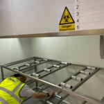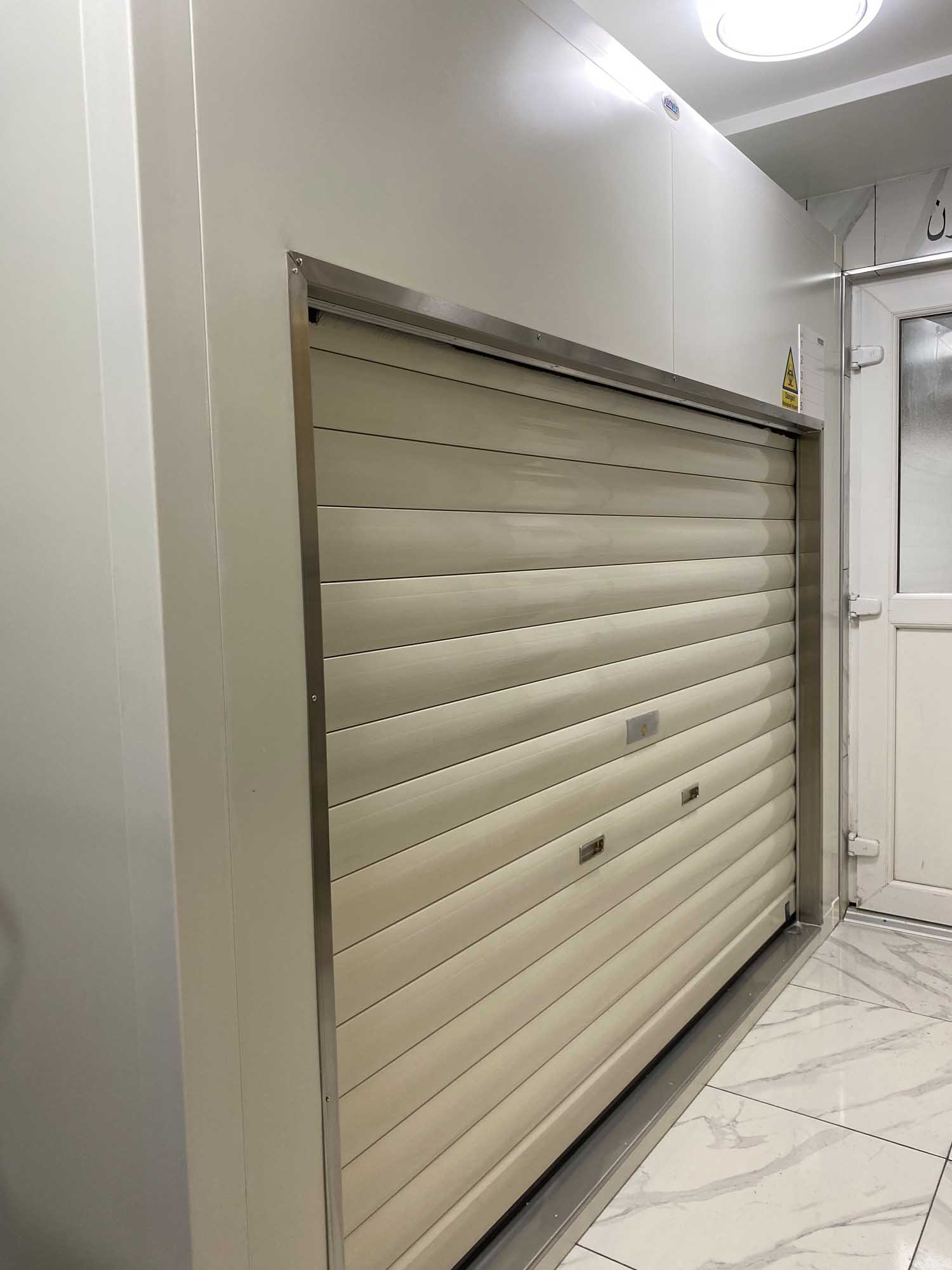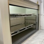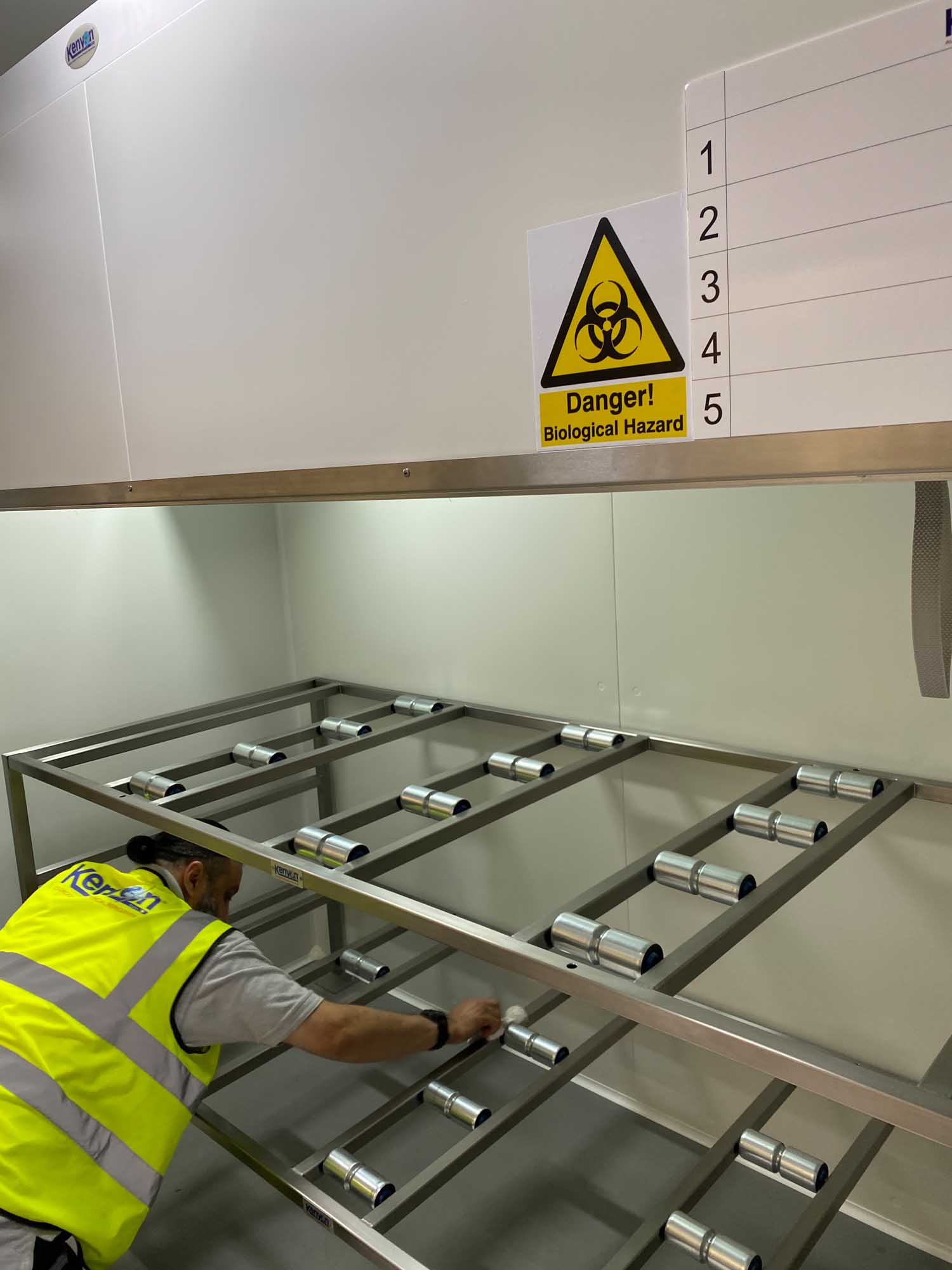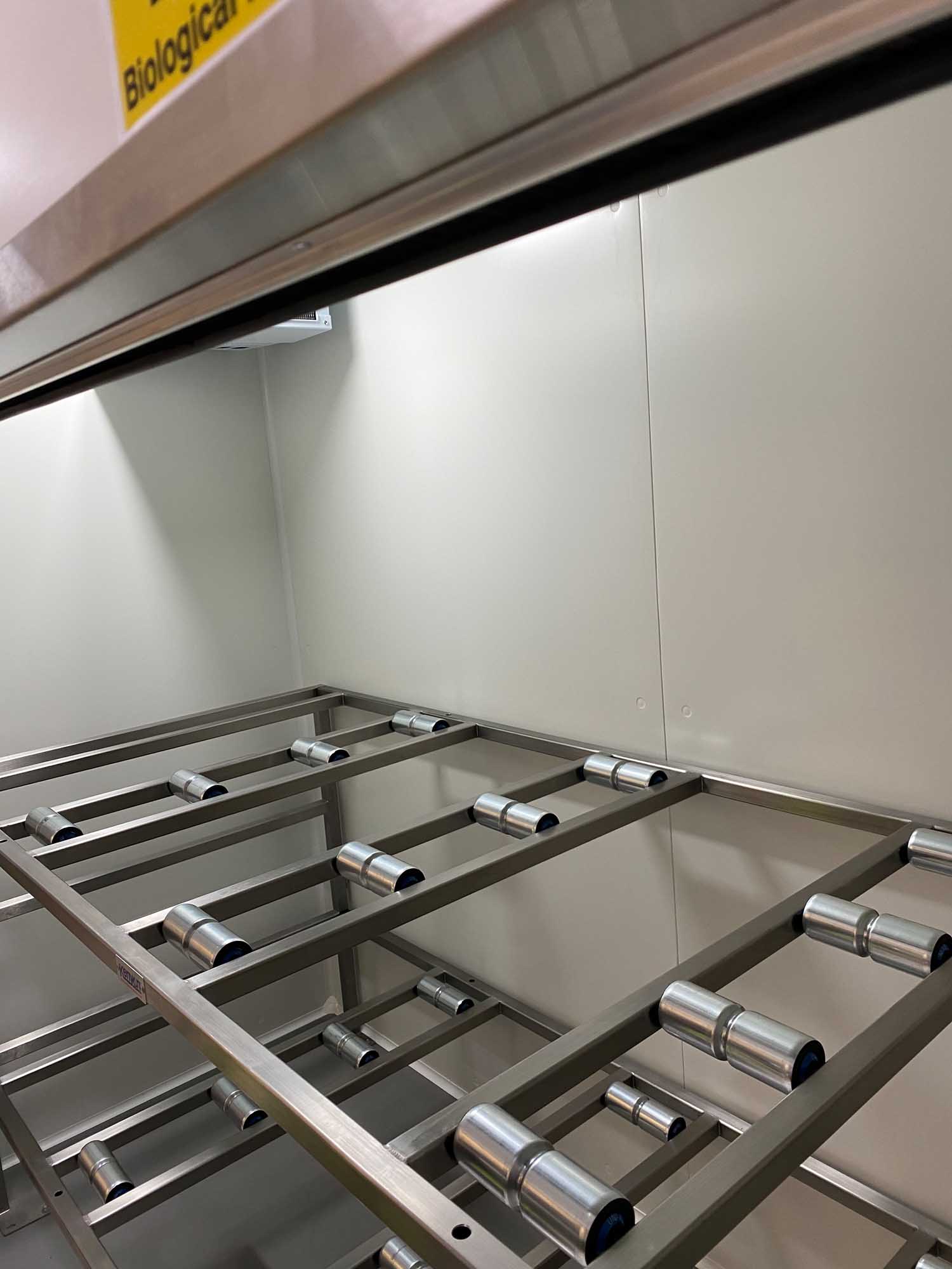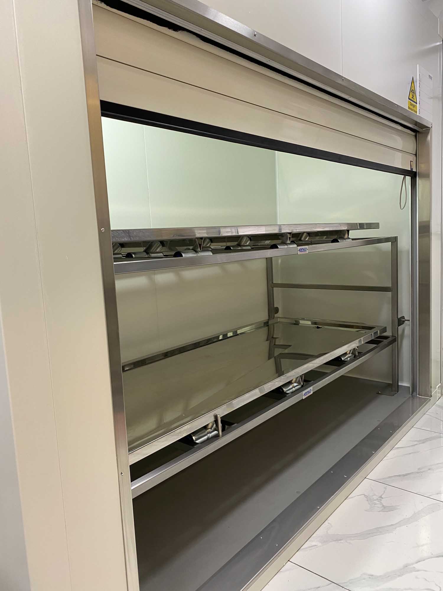 The Kenyon Lateral Chamber was fitted with an insulated roller shutter door, complete with rubber “sweeper gasket.” Interior furniture consisted of 316 Stainless Steel racking with stub rollers. The body trays were bright polished and 316 Stainless Steel complete with drain hole and plug.